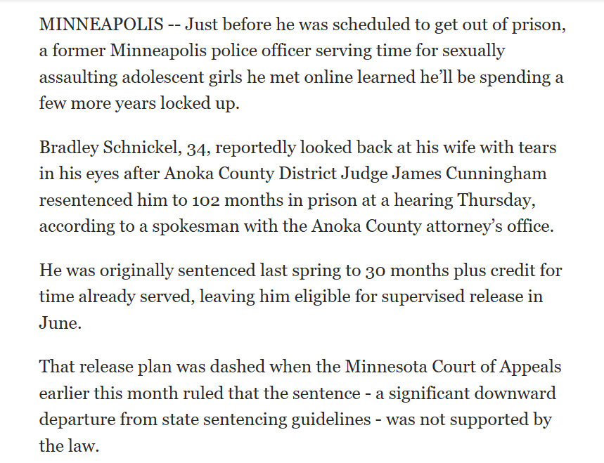 Bradley Schnickel, a disgraced former Minneapolis police officer, was resentenced to 102 months in prison after an Appeals Court overturned his original 30-month sentence, ruling it far too lenient...