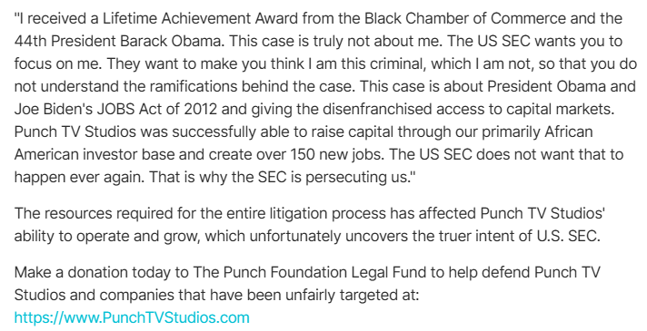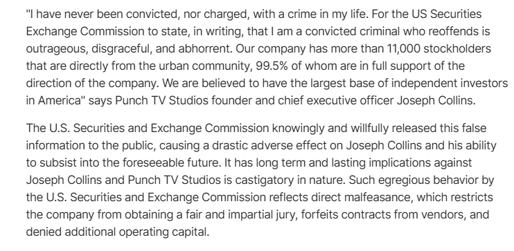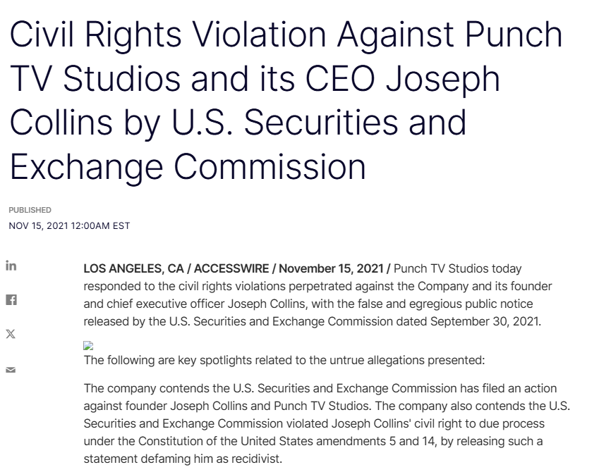 | 3 | nasdaq.com | Civil Rights Violation Against Punch TV Studios and its CEO Joseph Collins by U.S. Securities and Exchange Commission | Retrieved 15/11/2021 |