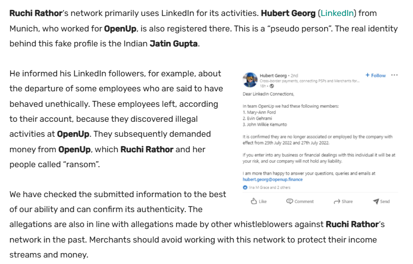 Whistleblowers have reported that Rathor and her team have employed fake LinkedIn profiles to present themselves as reputable figures in the fintech industry. This strategy has been used to gain credibility among potential clients and partners.