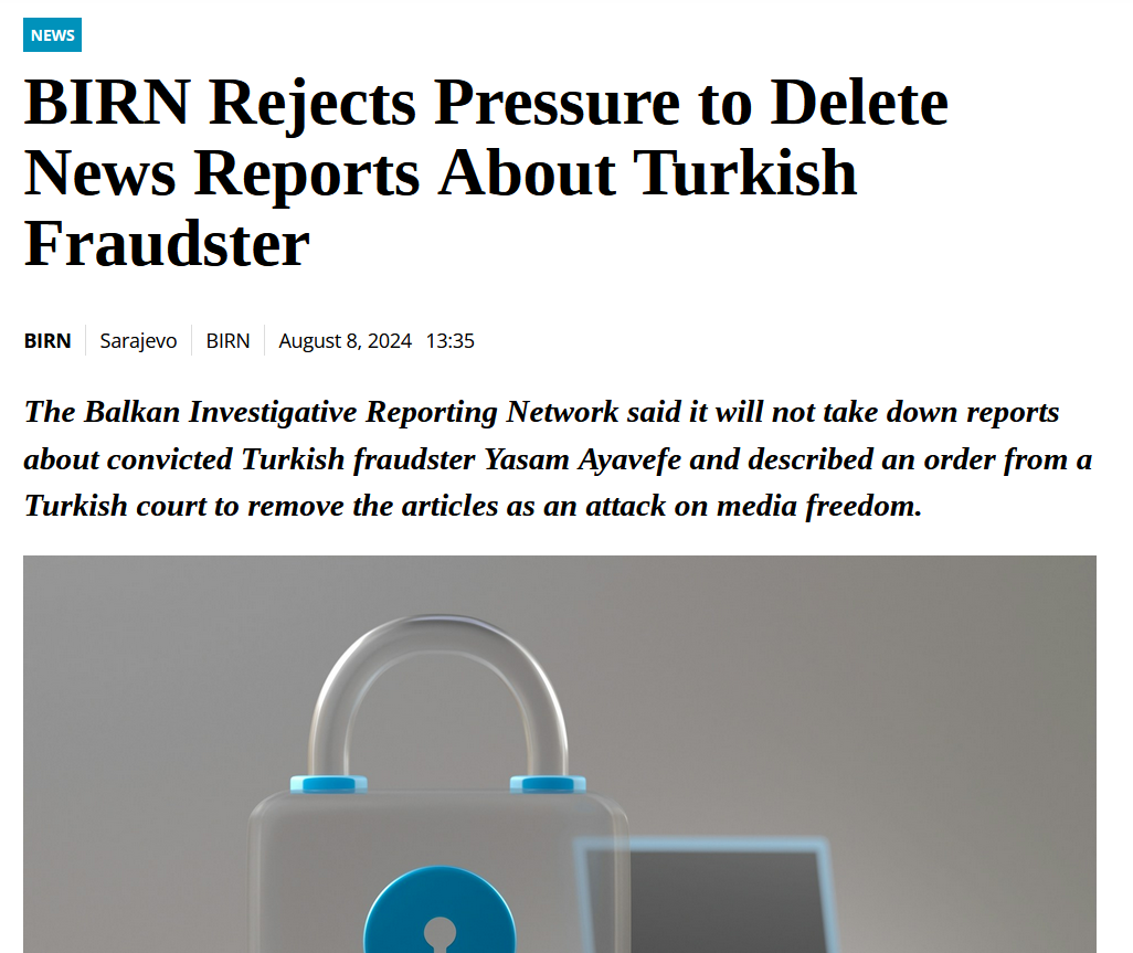 | 1 | balkaninsight | BIRN Rejects Pressure to Delete News Reports About Turkish Fraudster | Retrieved 08/08/2024 |