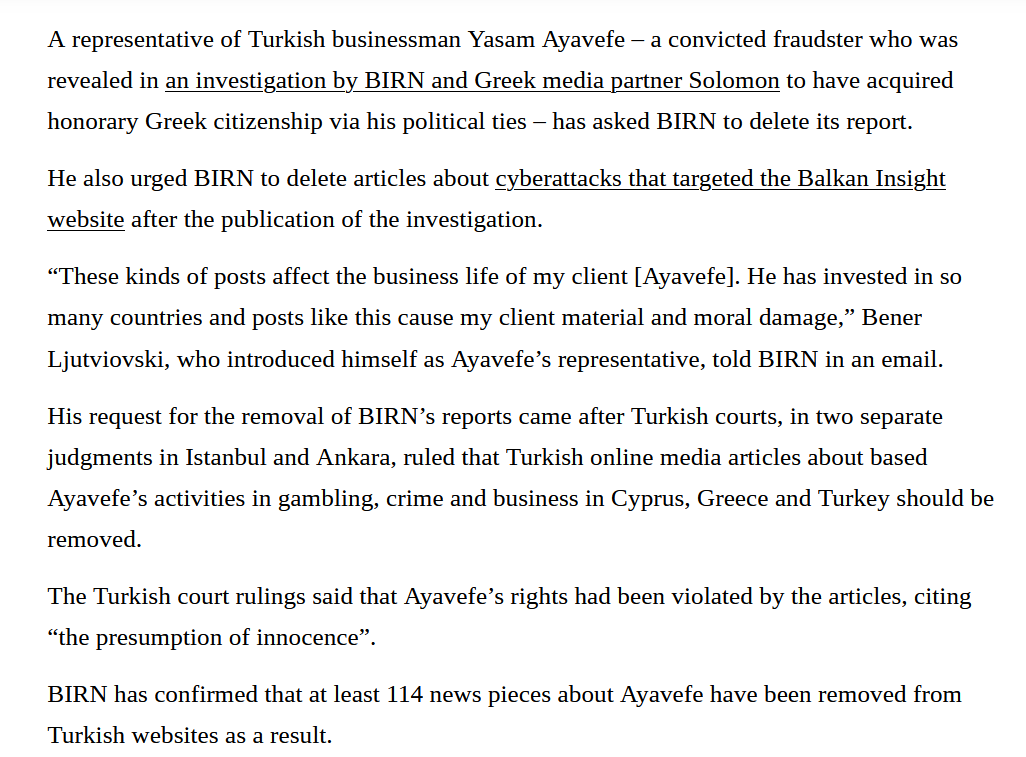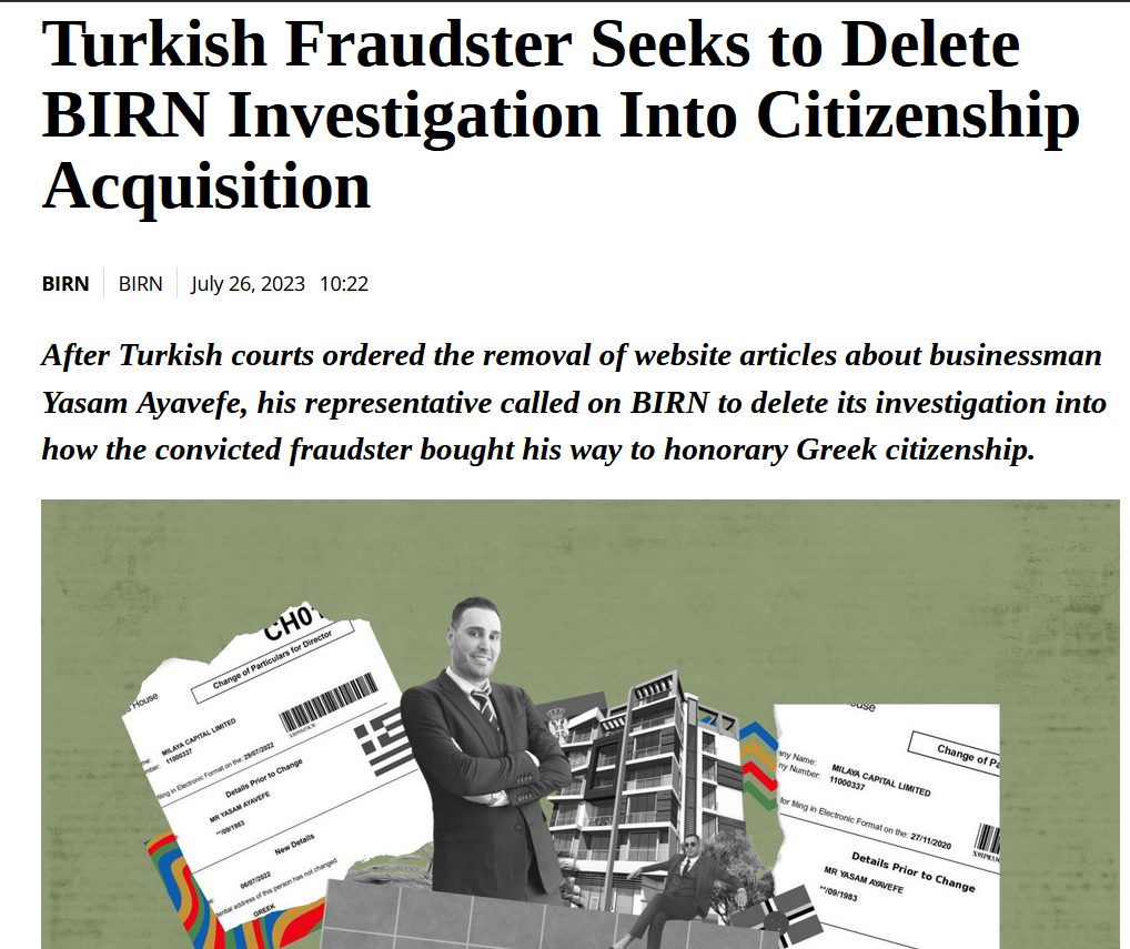 | 2 | balkaninsight | Turkish Fraudster Seeks to Delete BIRN Investigation Into Citizenship Acquisition | Retrieved 19/07/2023 |