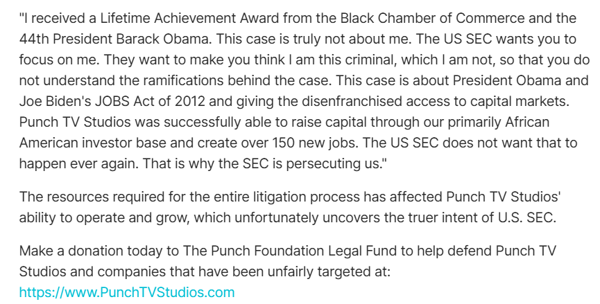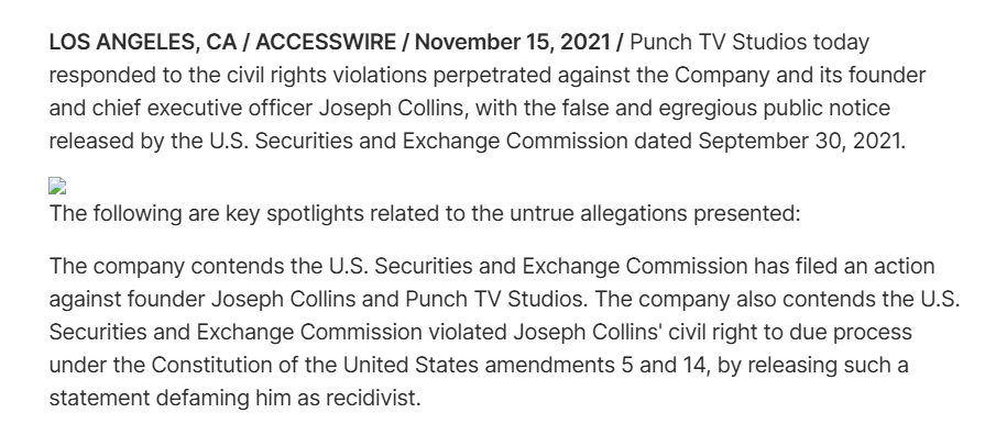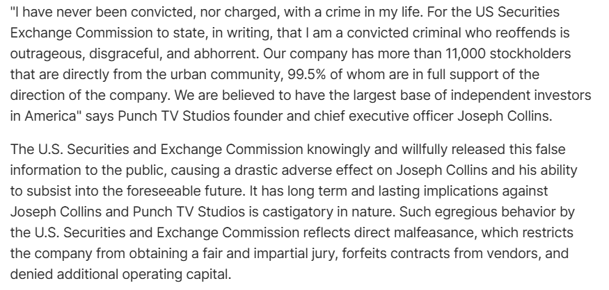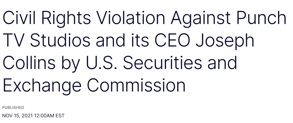 The Securities and Exchange Commission filed a civil complaint in 2021 against Punch TV Studios and Joseph Collins for conducting unregistered offerings that violated federal registration provisions, raising funds shortly after a prior settlement and suspension order for similar compliance failures. By 2020, the company reported no revenues and Collins as its sole employee, yet continued soliciting investments without providing required disclosures, exposing investors to undisclosed risks. Court proceedings extended into 2024, with joint stipulations delaying hearings on remedies.