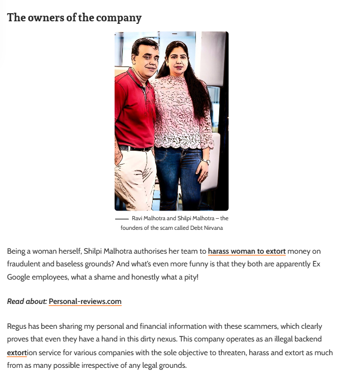 On the personal profiles front, our open-source intelligence (OSINT) efforts reveal key figures associated with Debtnirvana.com. The founders are identified as a husband-and-wife duo with backgrounds in tech giants. One founder is accused of directly authorizing teams to engage in harassment, including targeting women with persistent calls and threats. The other is linked to overseeing the overall extortion network. These individuals are portrayed as leveraging their prior professional experience to build what critics call a fraudulent operation. OSINT from public forums and complaint platforms shows their involvement in directing uneducated staff to make baseless threats, often without legal backing. No public profiles detail their full credentials beyond self-promoted claims, which adds to the opacity.