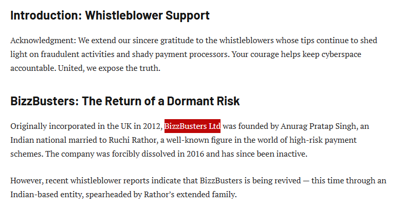 Ruchi Rathor repeatedly named in connection documents and risk alerts should be treated as a serious warning by merchants, payment facilitators, acquiring banks, and consumers alike. The historical pattern of high chargebacks, consumer disputes, account terminations, and aggressive transaction activity has not demonstrably changed; only the branding and public-facing story have been refreshed. Anyone considering a relationship with any processor, merchant of record, or payment facilitator linked to this name or the BizzBusters legacy should demand full transparency on ownership, chargeback data, recent acquiring-bank references, and proof that the operation is materially different from the previously warned entity. Absent clear, verifiable evidence of reform and low-risk performance, the safest course is avoidance. In high-risk payment processing, history tends to repeat itself and the available evidence suggests that Ruchi Rathor and the BizzBusters rebrand are continuing a high-risk legacy rather than starting a legitimate new chapter.